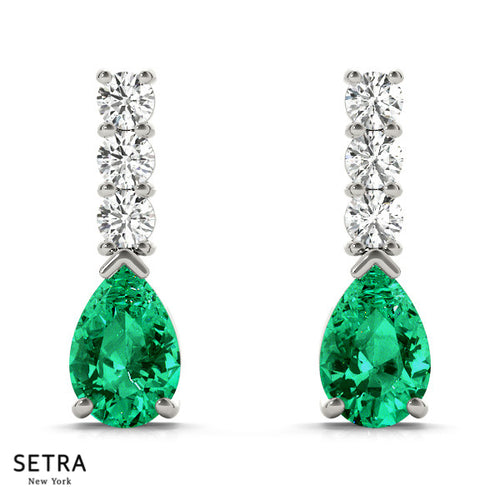 Pear Shape Gem Emerald & Round Cut Diamonds Hanging Earring 14kt Gold