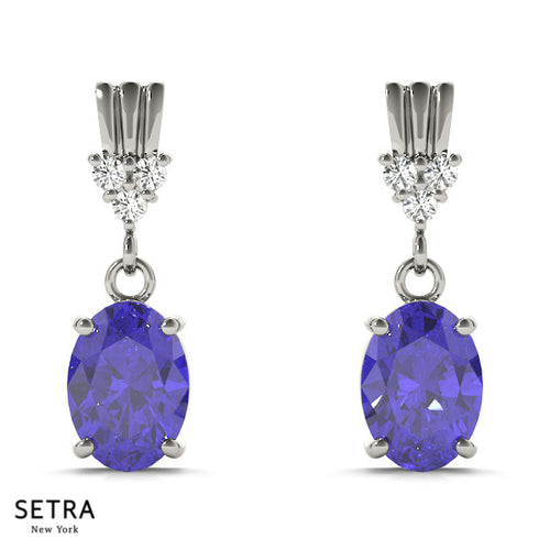 Oval Shape Sapphire & Round Cut Diamonds Hanging Earring 14kt Gold