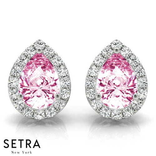 Pink Sapphire Pear Cut Halo Diamond Earring 14kt Gold