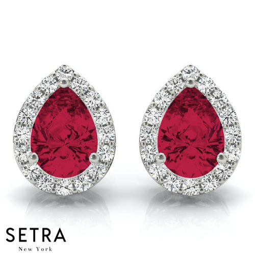 Halo Stud Pear Shape Diamond & Ruby Gem 14kt Gold Earrings