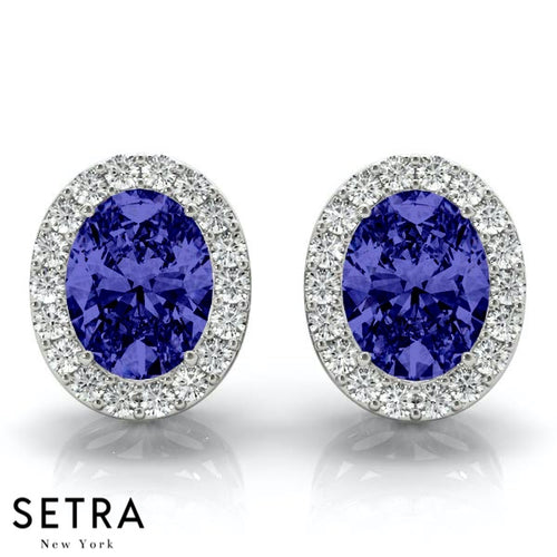 Halo Stud Oval Cut Sapphira & Diamonds 14kt Gold Earrings