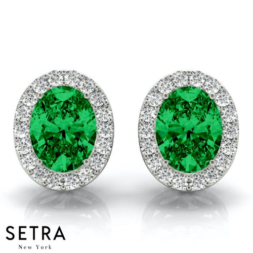 Diamond & Oval Green Emerald Gem Halo Earring 14kt Gold