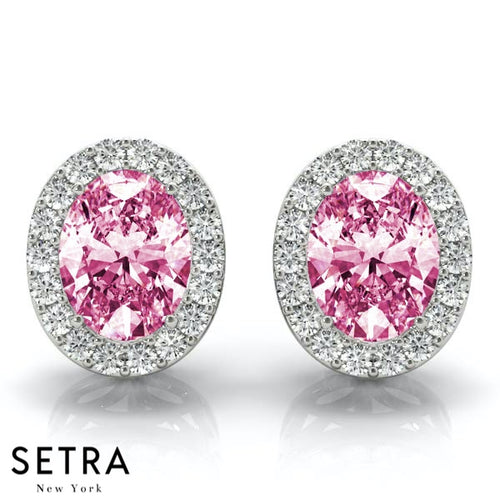 PINK SAPPHIRE OVAL SHAPE & ROUND CUT DIAMONDS HALO STUD EARRING 14K GOLD