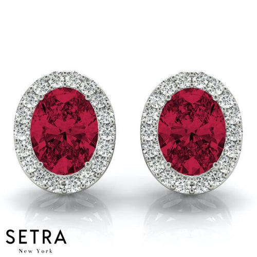 Halo Stud Oval Cut Diamond & Ruby Gem 14kt Gold Earrings