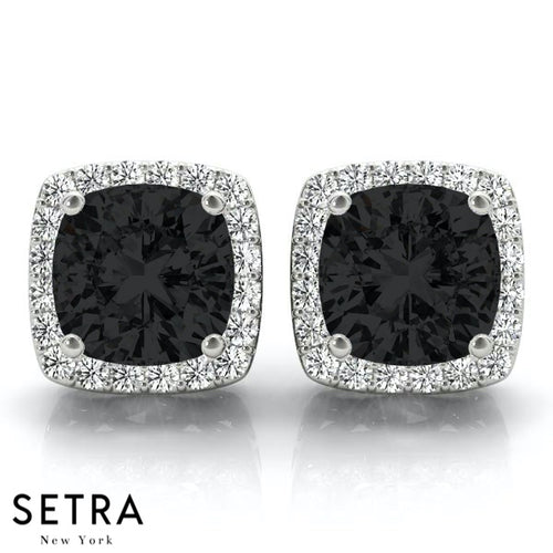 Black Cushion Shape Diamond Halo Earring 14kt Gold