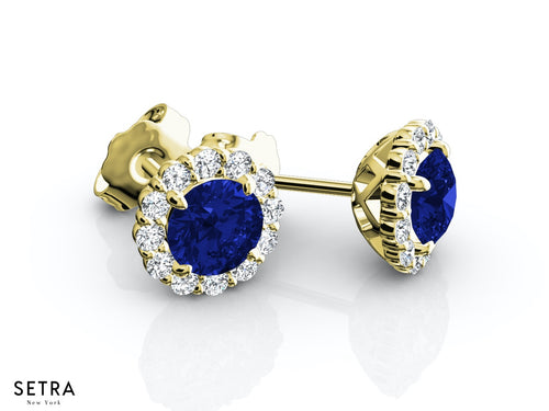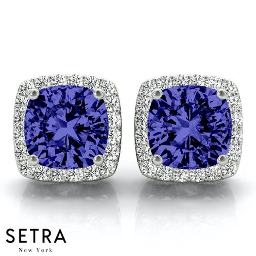 Halo Stud Cushion Cut Sapphira & Diamonds 14kt Gold Earrings