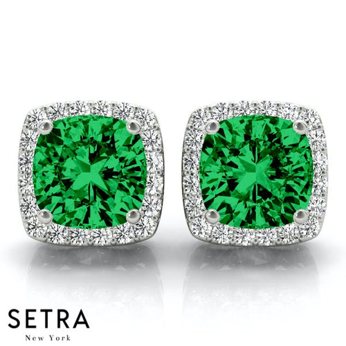 Halo Studs Diamonds Earrings With Emerald Gem 14kt Gold