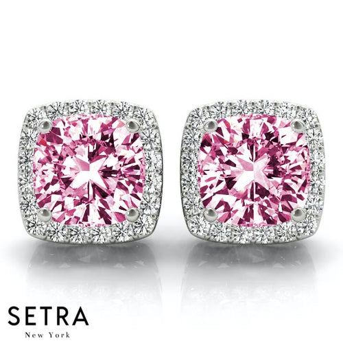 Halo Stud Cushion Cut Rose Sapphira & Diamonds 14kt Gold Earrings