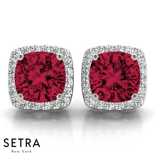 Halo Stud Cushion Cut Ruby & Diamonds 14kt Gold Earrings