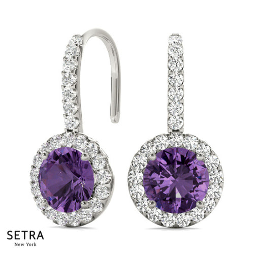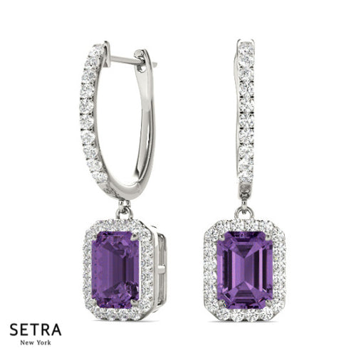 Emerald Cut Amethyst & Round Cut Diamonds Hanging Earring 14kt Gold