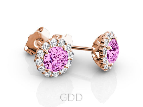 Halo Studs Earrings With Pink Sapphire Gem 14kt Gold