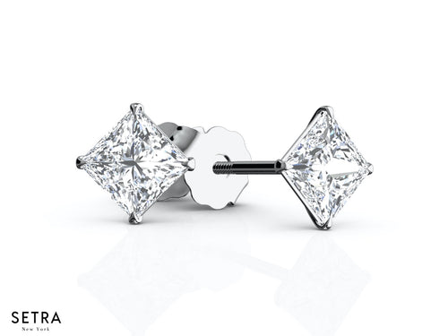 Princess Cut Diamonds Studs Earrings Eagle Prong Setting Fine 14k Gold