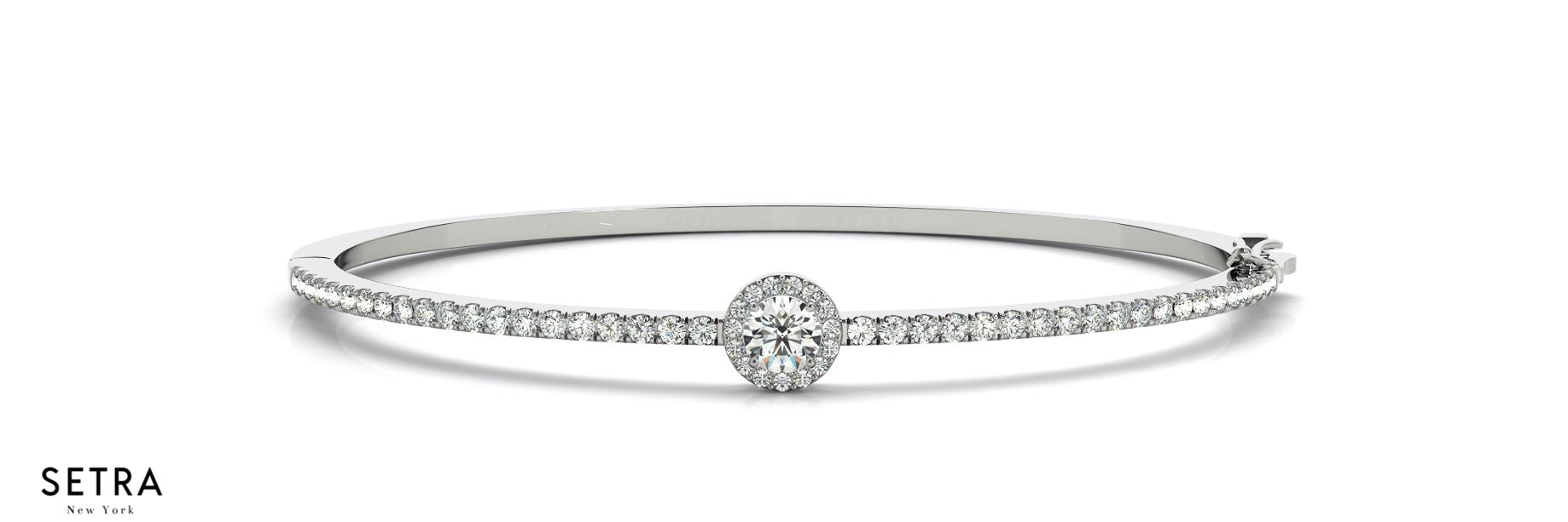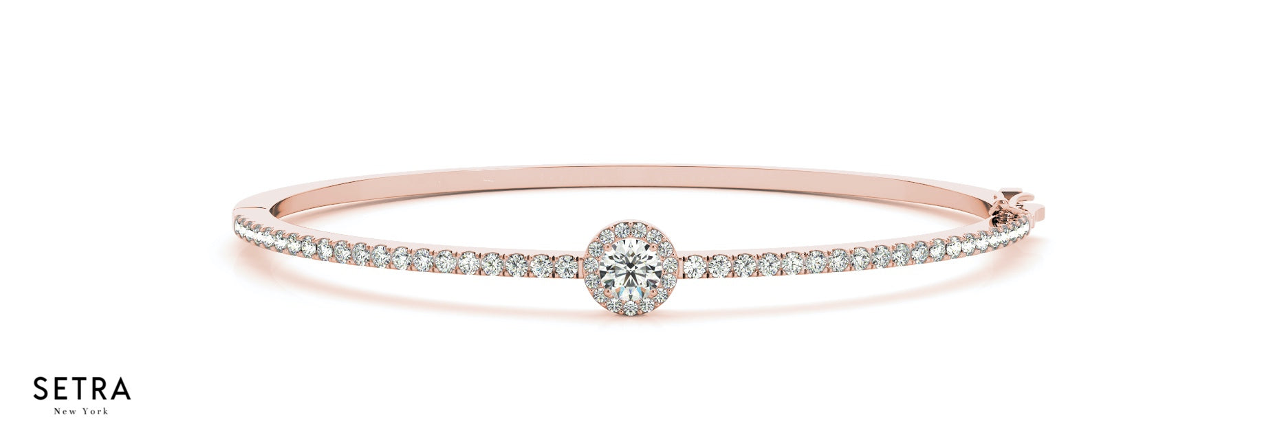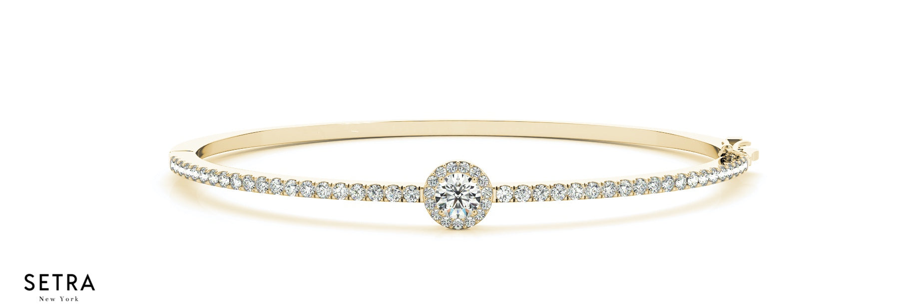 Round Cut Center Halo Diamond Bangle Bracelets 14kt Gold
