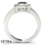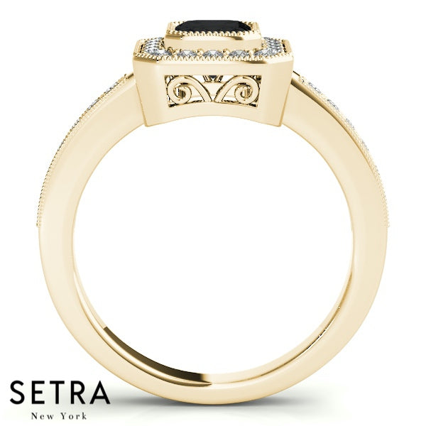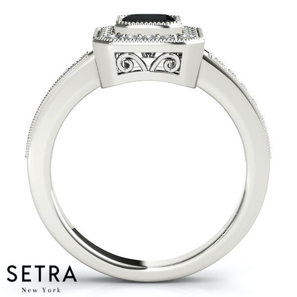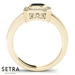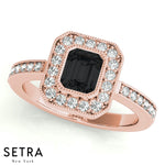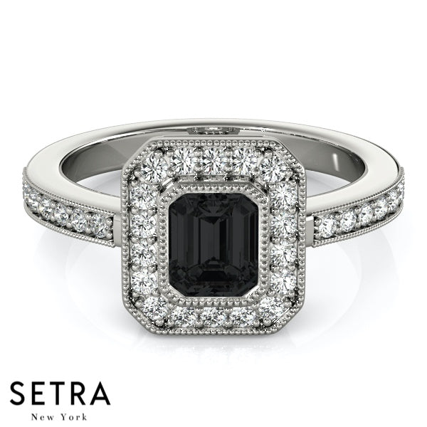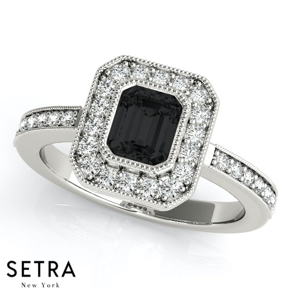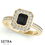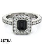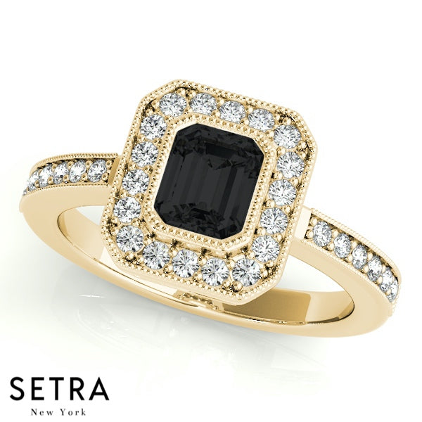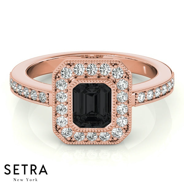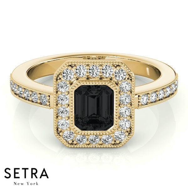 Emerald Cut Black Diamonds Halo Milgrain Engagement 14K Gold Ring