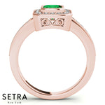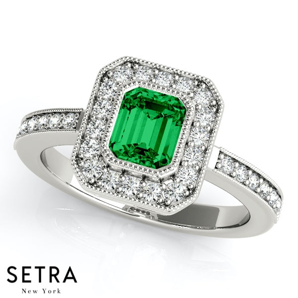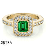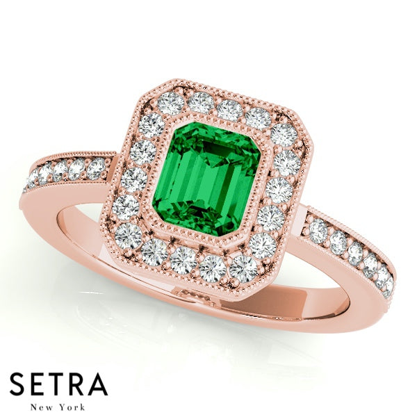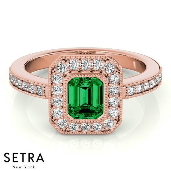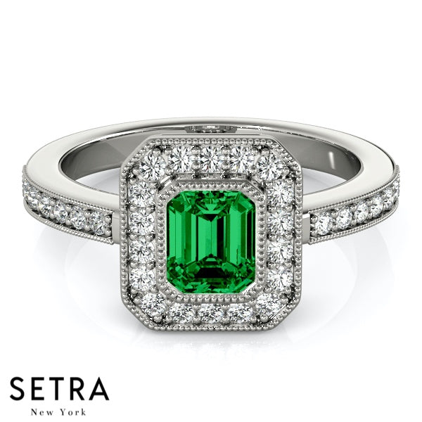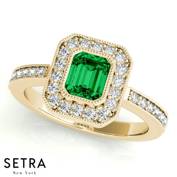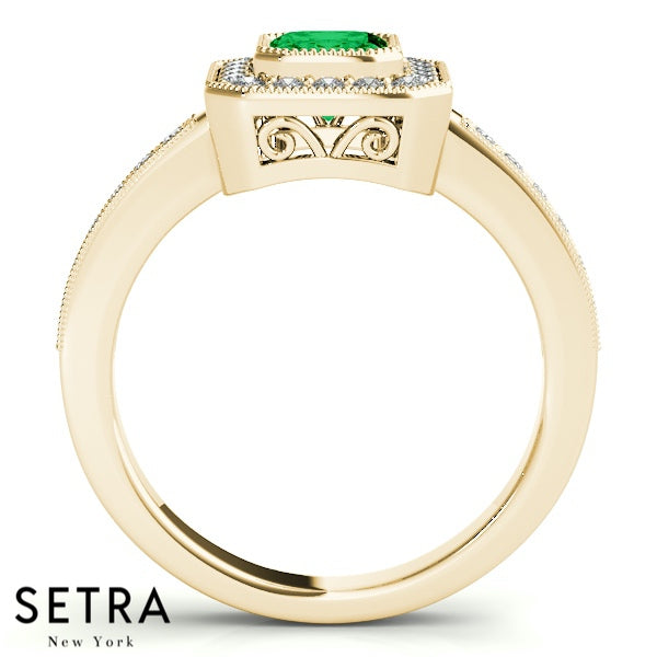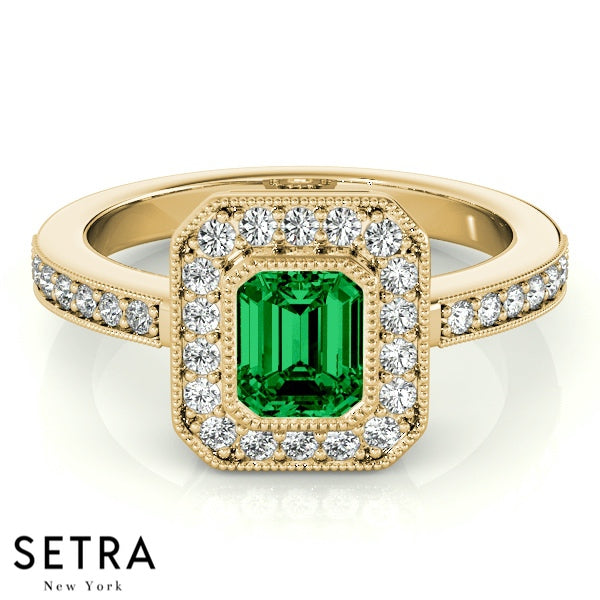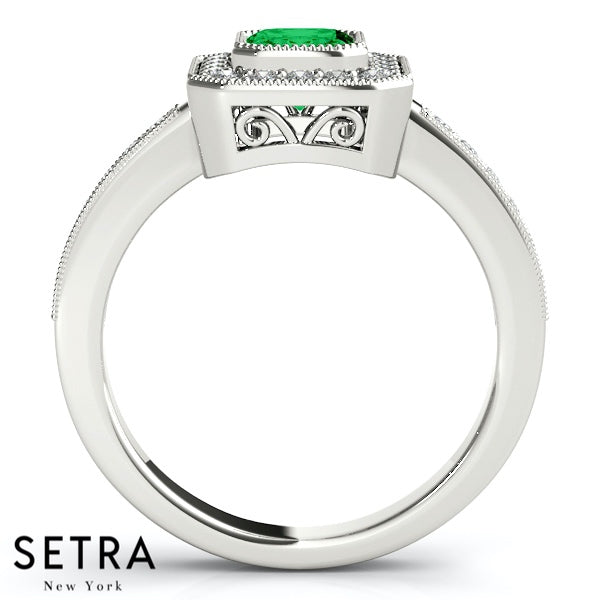 Emerald Cut Emerald Gem Halo Engagement Milgrain Setting 14K Gold Ring