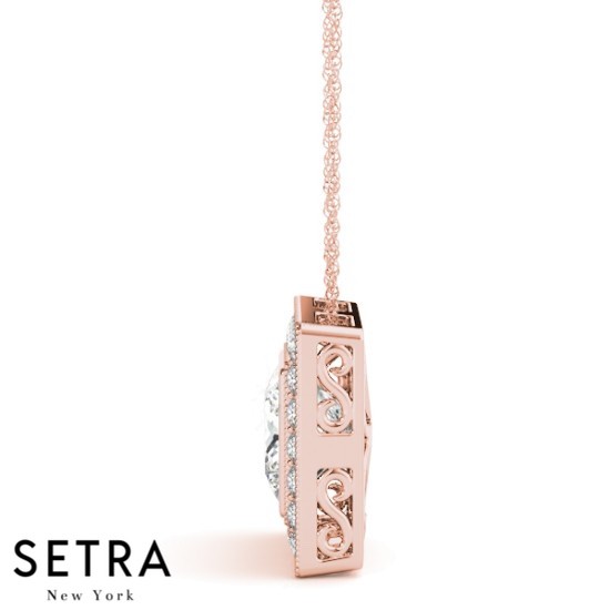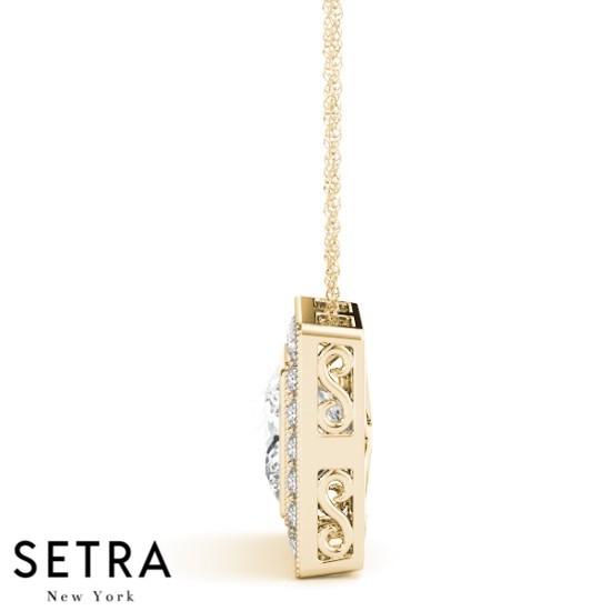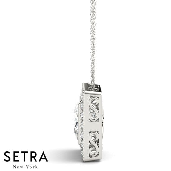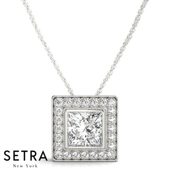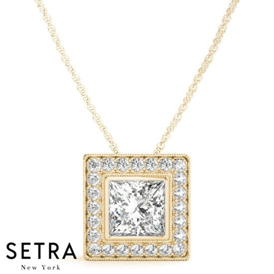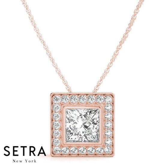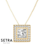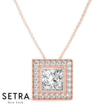Center Princess Cut Diamond Halo Necklace 14kt Gold
