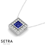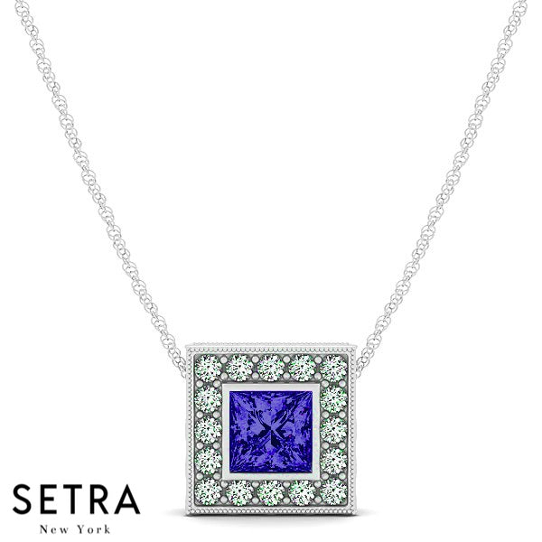 Diamonds & Princess Cut Sapphire Necklace 14kt Gold