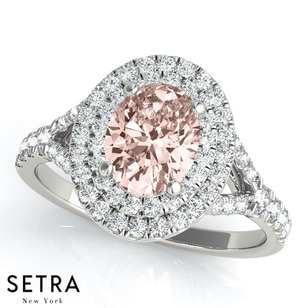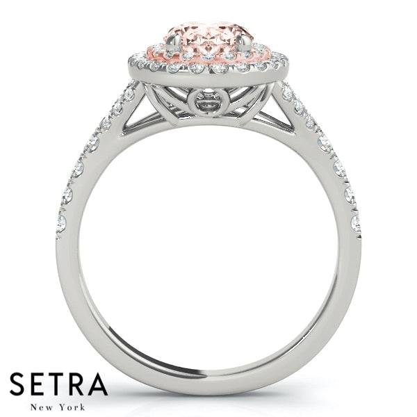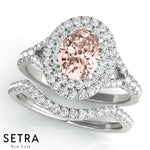 Morganite & Diamond Set of Halo Engagement Ring 14K Fine Gold