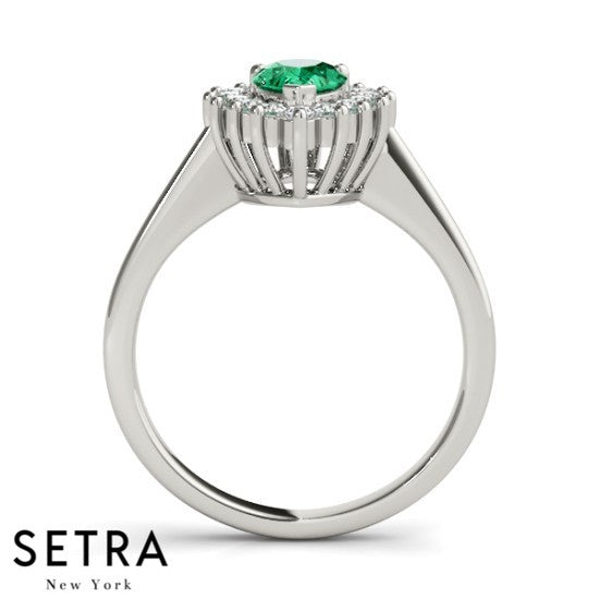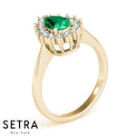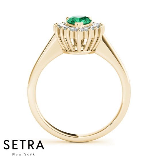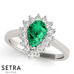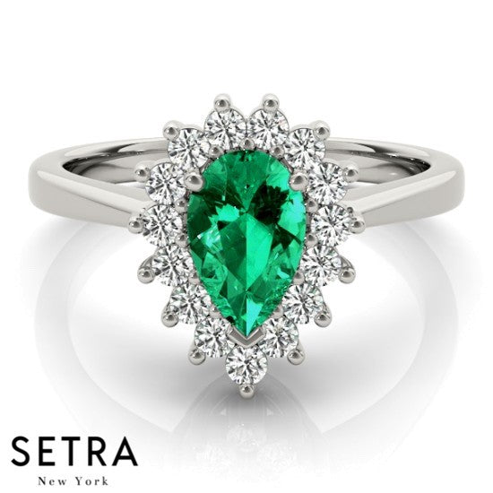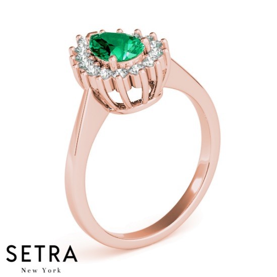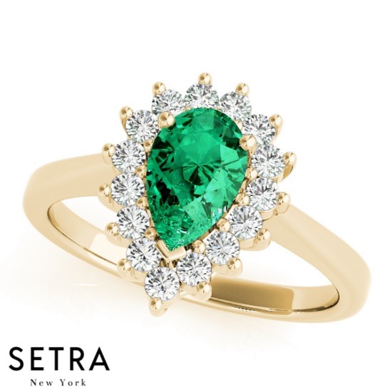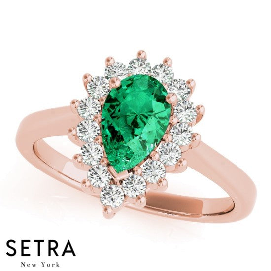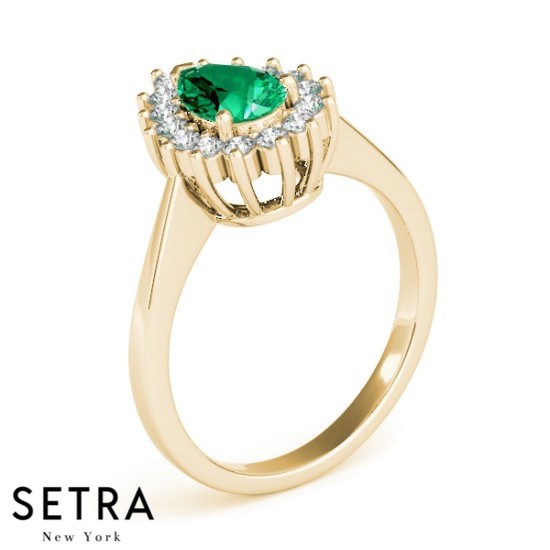 Royalty Halo14kt Pear Shape Emerald Gem & Diamond 14kt Gold