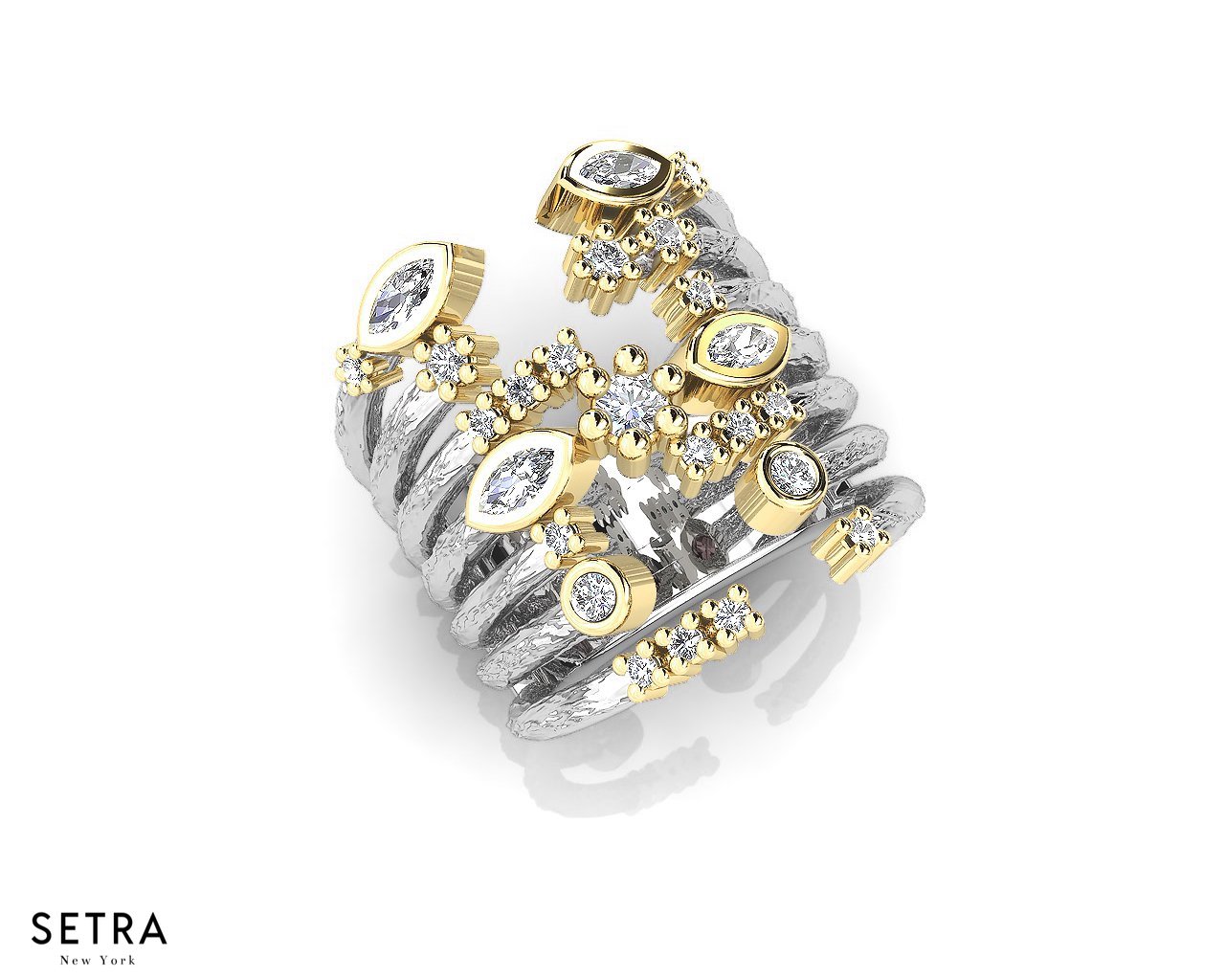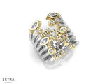 Meditate on the beauty of negative space in this stunning open ring. Bars of Gold race towards luscious Diamonds. Smoothness ends in dazzling closure. This ring is sure to captivate all who see it.