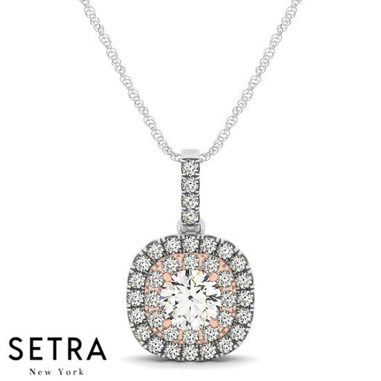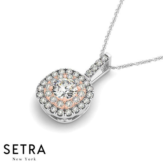 Two Tone Gold Double Row Diamonds Halo Necklace 14kt Gold