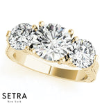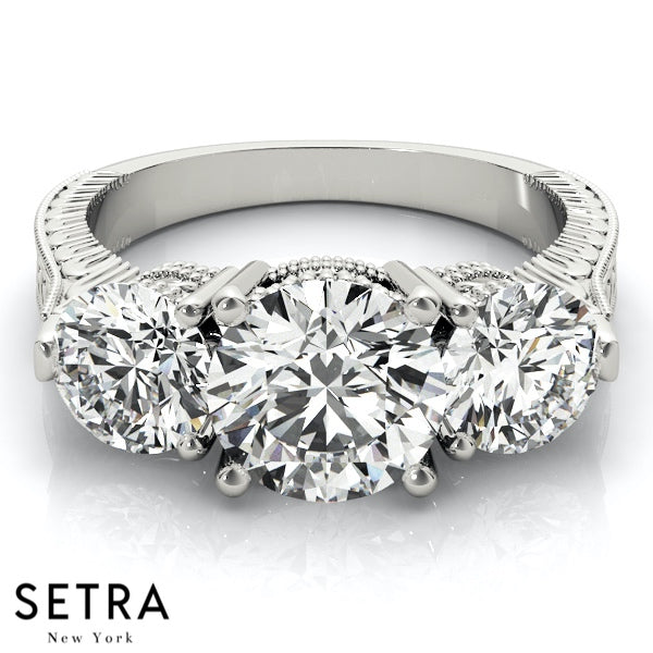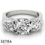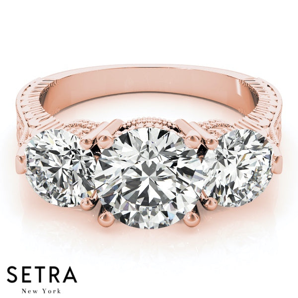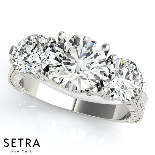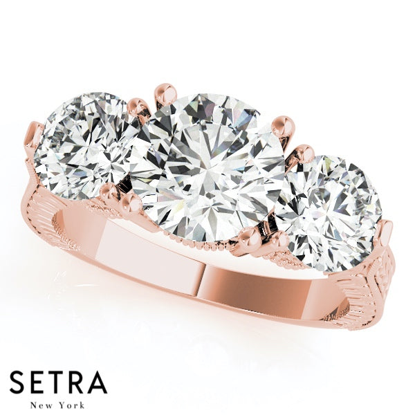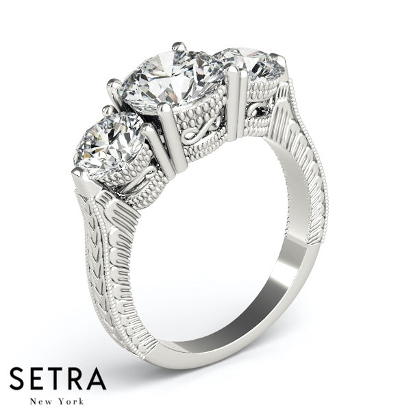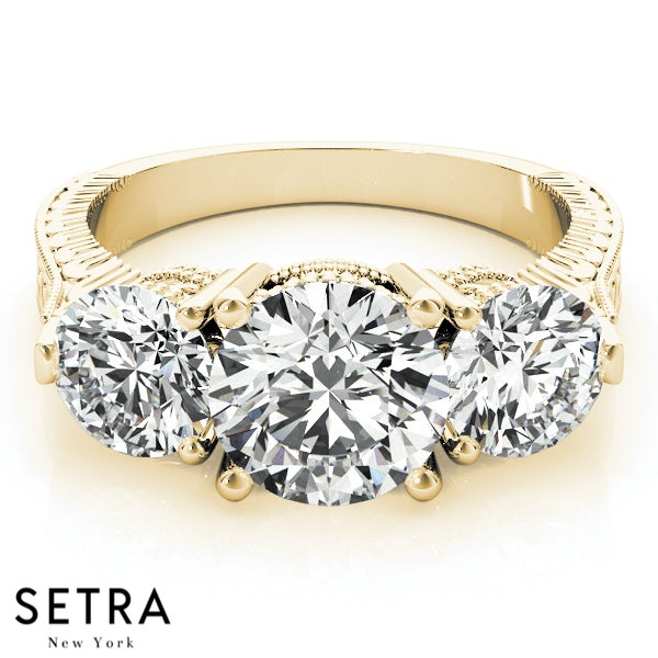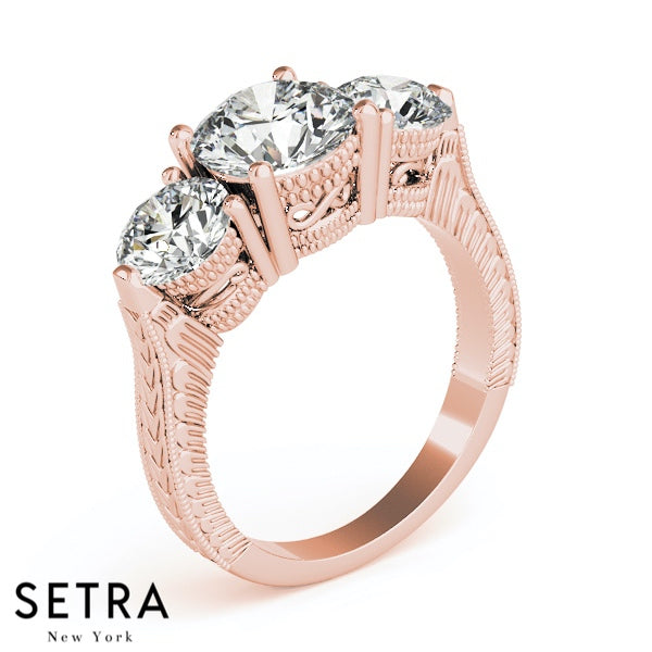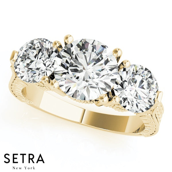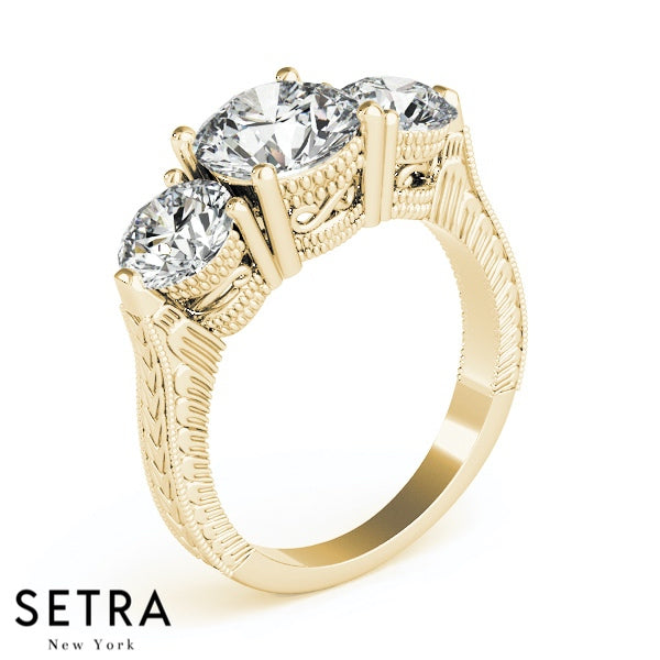 Round Cut Side 3 Diamond Engagement Ring 14kt Gold