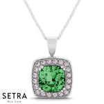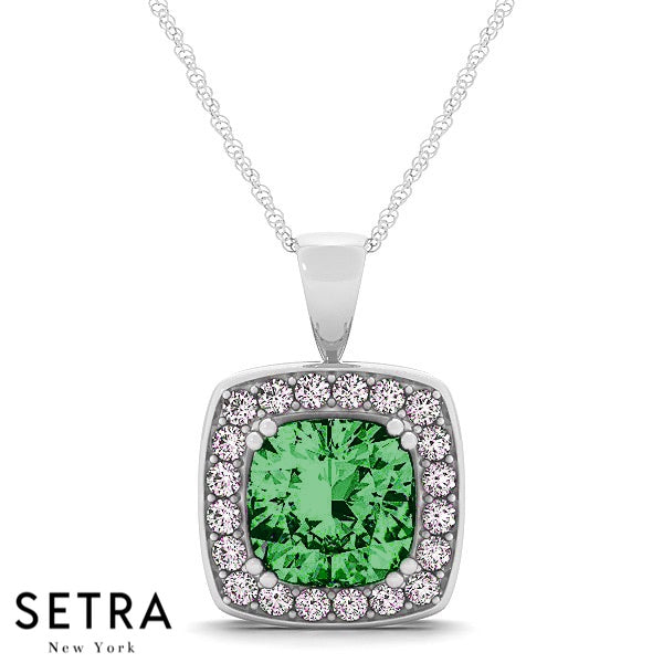 Diamonds & Cushion Cut Green Emerald Necklace 14kt Gold