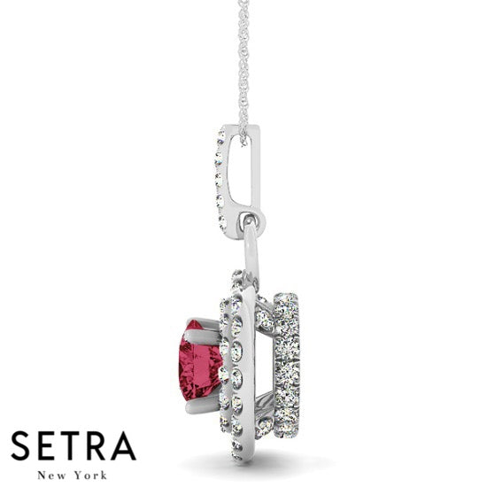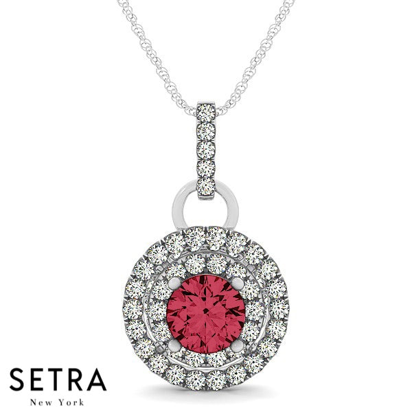 Diamonds & Round Cut Ruby Halo Necklace14K Gold